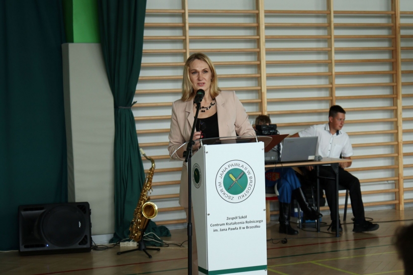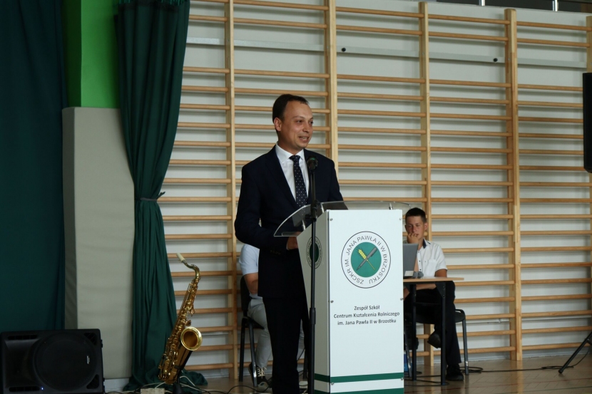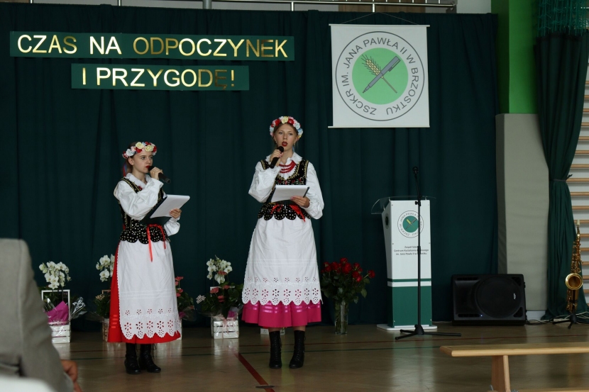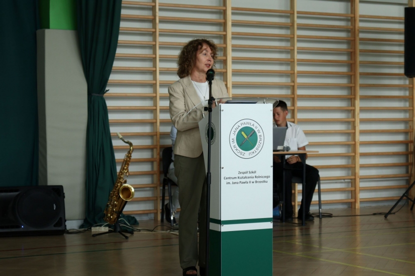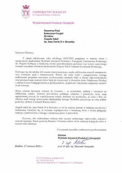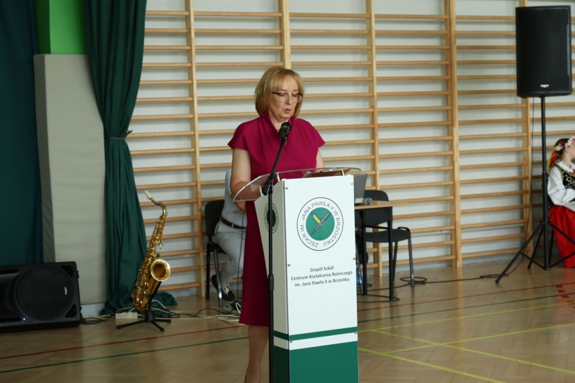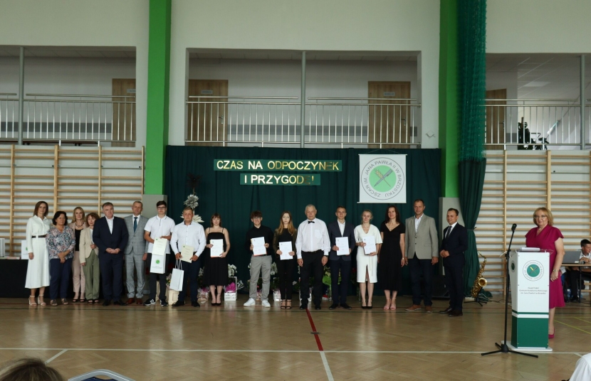 Zakończenie roku szkolnego 2024/2025 w Zespole Szkół Centrum Kształcenia Rolniczego im. Jana Pawła II w Brzostku było wyjątkowo uroczyste. Rozpoczęło się od pięknego występu tanecznego szkolnego zespołu folklorystycznego "Zgrani" - młodzież zaprezentowała wiązankę tańców rzeszowskich do muzyki kapeli "Zespołu Zastawnych" . W zakończeniu roku szkolnego wzięli udział zaproszeni, dostojni goście serdecznie powitani przez Dyrektor ZSCKR im. JP II w Brzostku Panią Katarzynę Grygiel. Wśród gości byli: Profesor Uniwersytetu Rzeszowskiego Pani Jadwiga Topczewska, Profesor Uniwersytetu Rolniczego im. Hugona Kołłątaja w Krakowie Pani Urszula Malaga Toboła, Kierownik Kasy Rolniczego Ubezpieczenia Społecznego w Dębicy - Pan Robert Mucha oraz Pan Dariusz Bieniasz, Kierownik biura powiatowego Agencji Restrukturyzacji i Modernizacji Rolnictwa w Dębicy – Pan Daniel Wójcik, Kierownik Wojewódzkiego Inspektoratu Ochrony Roślin i Nasiennictwa w Dębicy Pan Piotr Giza, Kierownik Powiatowego Zespołu Doradztwa Rolniczego w Dębicy - Pani Dorota Borska, przewodnicząca Szkolnej Rady Rodziców Pani Aneta Piątek. Nasi mili goście kolejno zabrali głos. Pan Robert Mucha przeczytał list Ministra Rolnictwa i Rozwoju Wsi Pana Czesława Siekierskiego, w którym zwrócił uwagę na ogromne inwestycje ministerstwa w szkoły rolnicze i zasadność tych inwestycji w kształtowaniu pokolenia rolników, którzy stanowią bardzo ważny filar gospodarki krajowej. Głos zabrała również Profesor Uniwersytetu Rolniczego w Rzeszowie Pani Jadwiga Topczewska, która zwróciła uwagę na konieczność współpracy naszej szkoły z uczelnią, zachęcała również uczniów do podejmowania nauki na Uniwersytecie w Rzeszowie w związku z dużymi potrzebami pracowników w administracjach instytucji rolniczych. Zachęcała młodzież do inwestowania w siebie, zwróciła uwagę, że wiedza jest ważną wartością, która uszlachetnia człowieka. Następnie głos zabrała Pani Urszula Malaga Toboła Profesor Uniwersytetu Rolniczego im. Hugona Kołłątaja w Krakowie - odczytała list Rektora UR Pana Profesora Sylwestra Tabora, w którym zwrócił uwagę, aby dostrzegać sens edukacji, ponieważ jest ona ważną wartością w życiu każdego człowieka. Rektor UR w Krakowie życzył młodzieży udanego wypoczynku, wytrwałości w dążeniu do celu, aby byli dociekliwi i nie bali się zadawać pytań. Pani Profesor Urszula Malaga Toboła z Instytutu Zarzadzania i inżynierii produkcji UR w Krakowie zwróciła uwagę na konieczność współpracy naszej szkoły z instytutem, podziękowała za zaproszenie i życzyła wszystkim radosnych, bezpiecznych wakacji. Głos zabrał również Kierownik ARiMR w Dębicy Pan Daniel Wójcik, który przypominał o współpracy naszej szkoły z Agencją, w pełnych sympatii słowach życzył udanych, bezpiecznych wakacji.