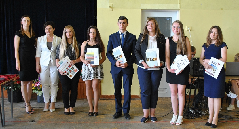 Na uroczystym zakończeniu roku szkolnego 2016/2017 dyrektor szkoły pani Katarzyna Grygiel i opiekun Kawiarenki Literackiej Teresa Młyniec wręczyli nagrody książkowe za pracę kulturalną w szkole i środowisku. Członkowie Kawiarenki: mama Dominika Szarka, Kinga Pruchnik, Małgorzata Wojdyła i Wojtek Zastawny oraz nieobecni na zdjęciu Patryk Czajka i Grzegorz Grygiel.