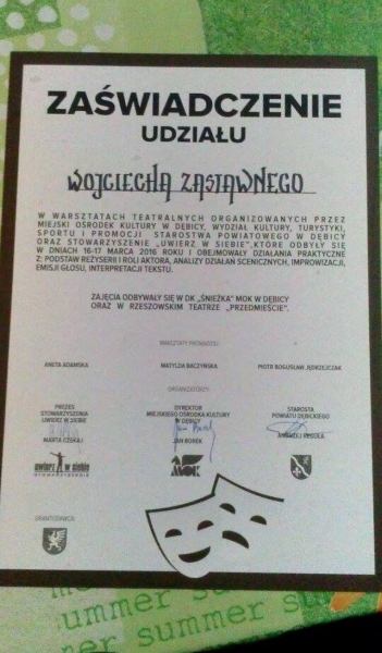 Kinga i Wojtek na zakończenie warsztatów otrzymali Zaświadczenia udziału .Gratulujemy młodym aktorom!