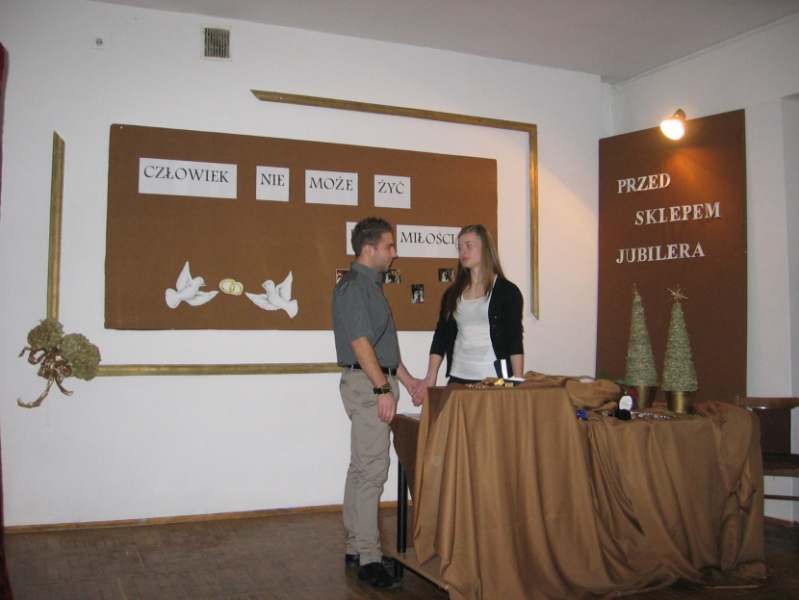 6 grudnia w czytelni biblioteki szkolnej odbył się spektakl teatralny wykonany przez uczniów działających przy Kawiarence Literackiej. Impresja teatralna oparta została na motywach sztuki Karola Wojtyły Przed sklepem jubilera. Sztuka mówiła o najwyższym z uczuć i tym, co z nim związane- o miłości i małżeństwie. Pełna była wartościowych przemyśleń. Została przedstawiona w sposób odmienny od oryginału, w sposób prostszy , wzbogacona scenkami z życia współczesnych małżeństw- stała się w ten sposób łatwiejsza w odbiorze. Starannie przygotowane dekoracje - przybliżyły namiastkę sceny teatralnej. Uczniowie wykazali się dużymi zdolnościami aktorskimi, pokonali tremę , pokazali umiejętność zaprezentowania się na scenie. Dali tym samym przykład innym uczniom, że szkoła daje wiele możliwości- uczy, rozwija zainteresowania, wzbogaca intelektualnie i duchowo. Wystapili: Gac Anna, Reguła Agnieszka, Straciło Mateusz, Jedziniak Staszek, Gacoń Marta, Wójcik Sylwia, Skocz Tomek, Nowak Grzesiek, Kurek Beata, Pieczonka Joanna, Skowron Artur, Kamil Bielecki, Paweł Nylec, Golec Katarzyna, Błoniarz Grzesiek, Urszula Chajec http://www.youtube.com/watch?v=31nC_lVEMPo http://www.youtube.com/watch?v=FgI1ujUlNg8 http://www.youtube.com/watch?v=_p03ROGRTLI http://www.youtube.com/watch?v=owJe7PitQcI http://www.youtube.com/watch?v=flevDrECqyo