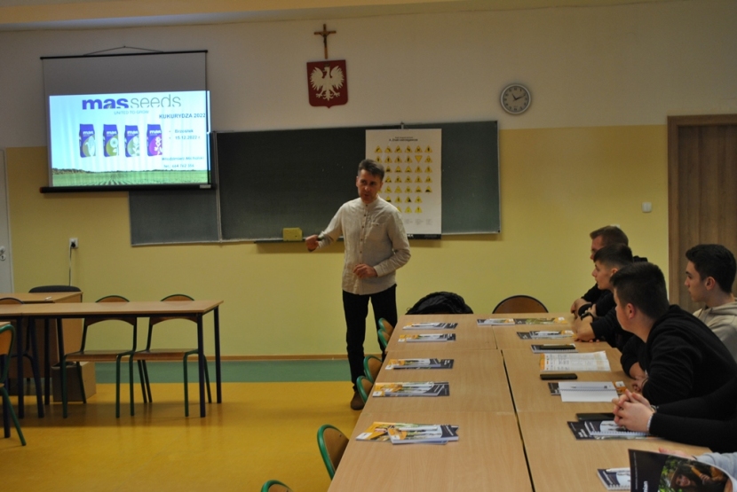 Współczesne rolnictwo bazuje na wiedzy naukowej i najnowszych zdobyczach techniki. W związku z tym spotkanie, które miało miejsce dnia 15.12.2022 roku w ZS CKR w Brzostku z Firmą Mas Seeds zajmującą się tworzeniem programów hodowlanych, których celem jest wytwarzanie nowych odmian kukurydzy, słonecznika, rzepaku i lucerny pomaga znacząco w edukacji uczniów. W prezentacji przedstawionej przez pana Włodzimierza Michalskiego można było bliżej poznać w jaki sposób należy prowadzić uprawę kukurydzy i jakie czynniki mają decydujący wpływ na opłacalność uprawy tej rośliny. Pan Michalski w sposób profesjonalny przekazał wiedzę na temat uprawy kukurydzy, za co został nagrodzony gromkimi brawami przez uczestników Koła Mechanizacyjnego. Uczniowie otrzymali też drobne upominki od Firmy Mas Seeds, za co jesteśmy bardzo wdzięczni. Dzięki temu spotkaniu zdobyliśmy również nowe doświadczenie oraz wiedzę co w przyszłości z pewnością zaowocuje lepszymi wynikami – nie tylko w nauce.