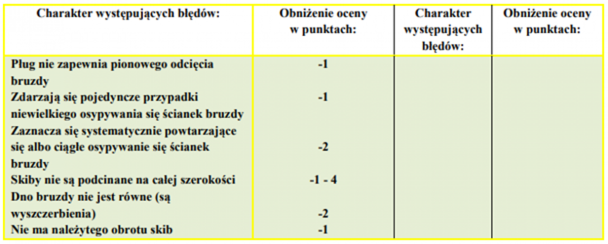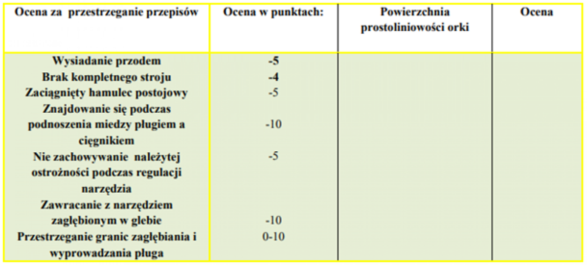 Ocenę obniża się za każdy przypadek zagłębiania lub wyciągnięcia pługa z ziemi bliżej albo dalej aniżeli 0,5 m od ustalonej linii początku orki (po jednym punkcie).