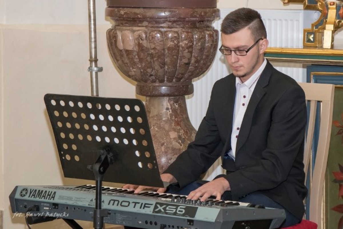 Uczestnicy szkolnego zespołu muzycznego wspierają organizację Powiatowego Konkursu Piosenki Religijnej.