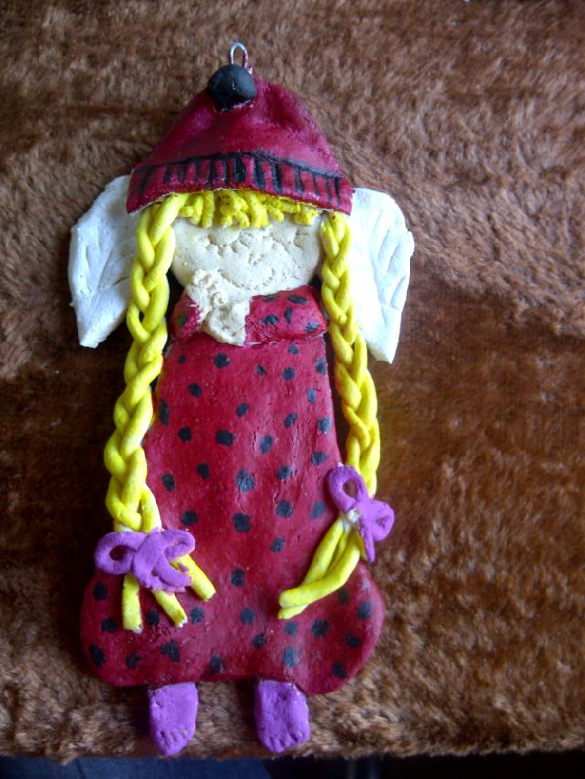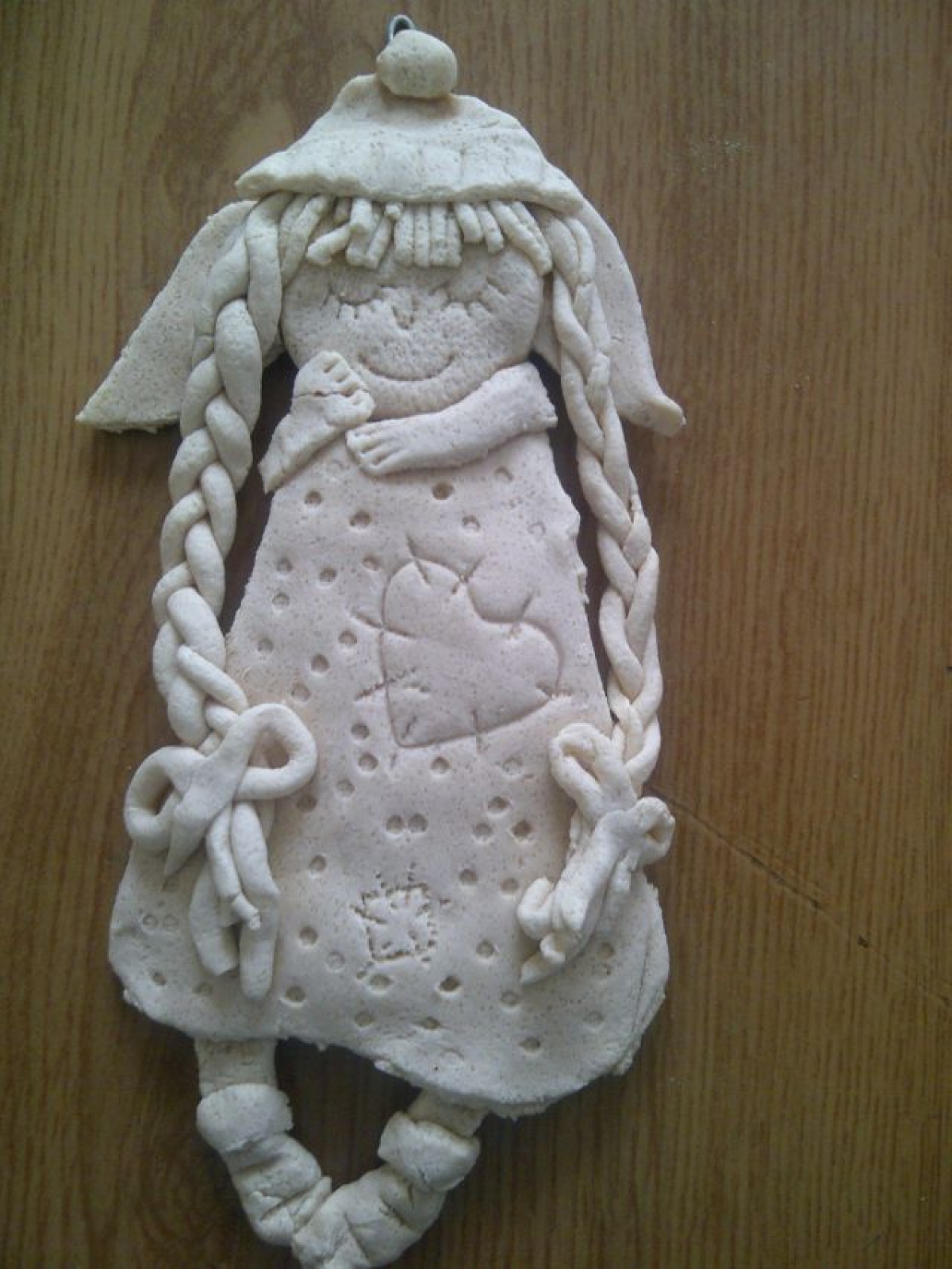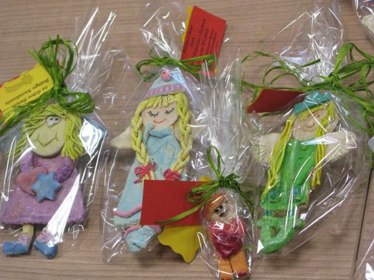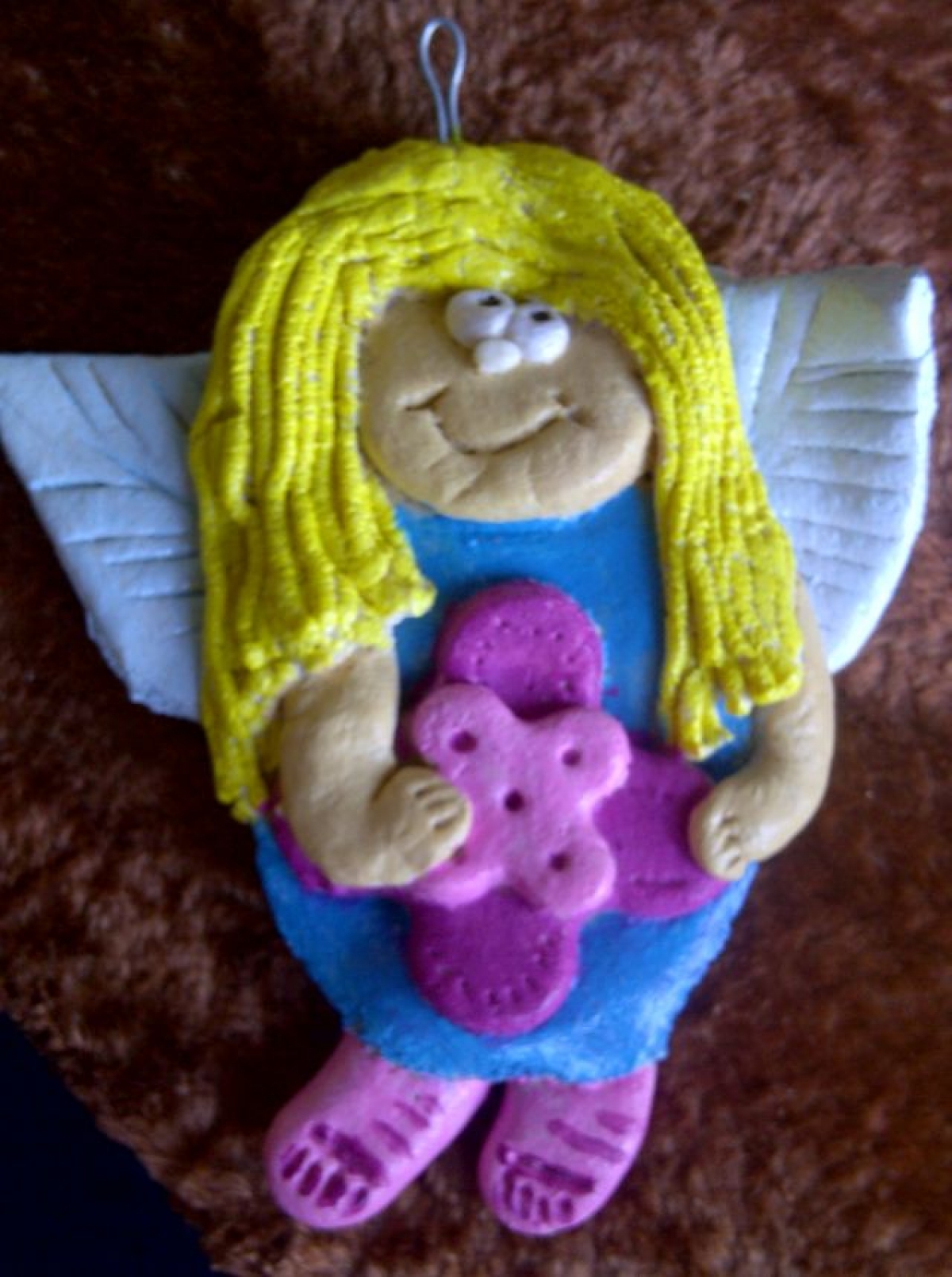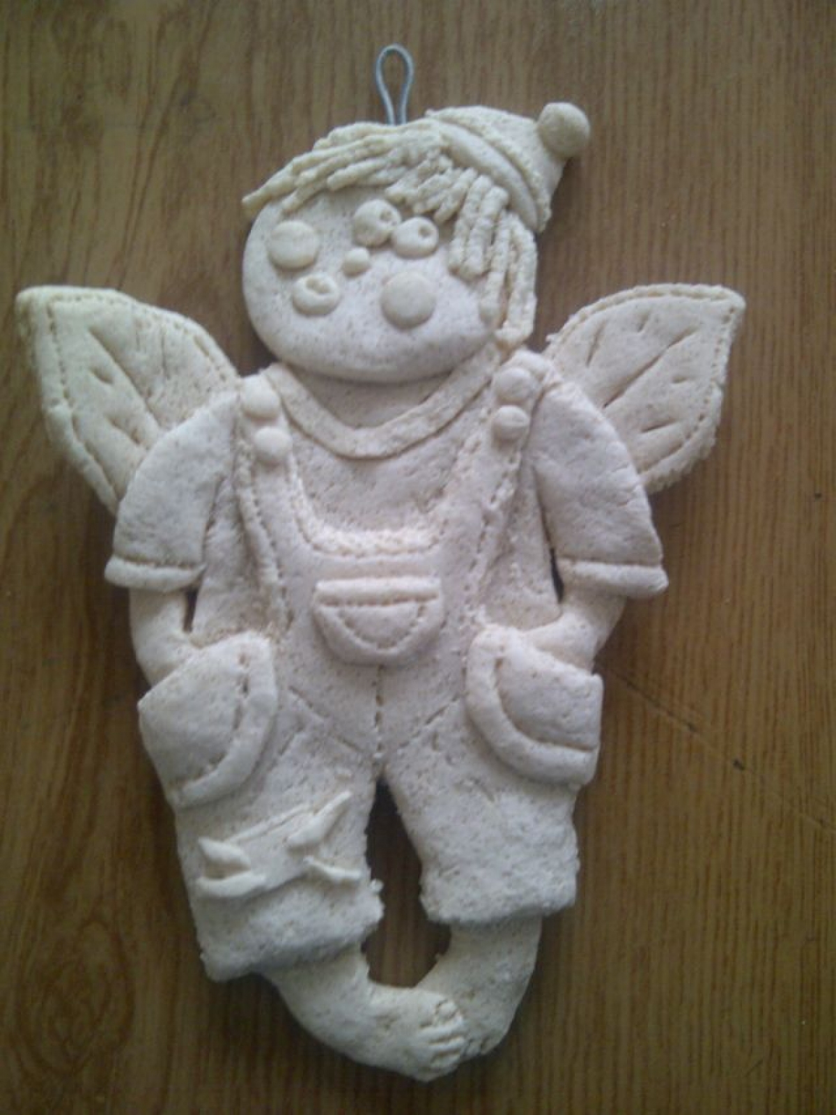 Kolejnym pomysłem było tworzenie aniołków z masy solnej…zajęcie pracochłonne, a szczególnie oczekiwanie na wypieczenie się tych „skrzydlatych ciasteczek”. Dla porównania efektu końcowego umieszczamy zdjęcia przed i po malowaniu aniołków farbami: