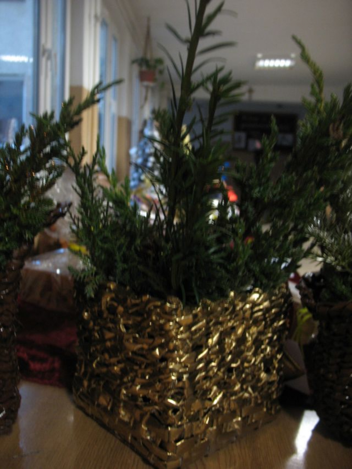Naszą twórczość zaczęliśmy od skręcania rurek z gazet. Następnie zostały z nich wyplecione koszyczki. Pomalowane wyglądają tak:
